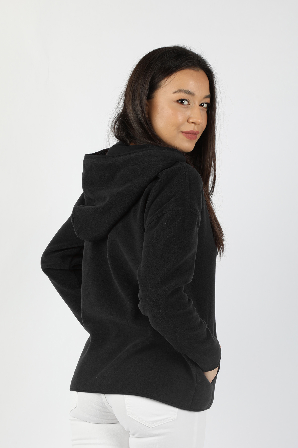 Kadın Kapüşonlu Önü Biyeli Fleto Cepli Polar Siyah