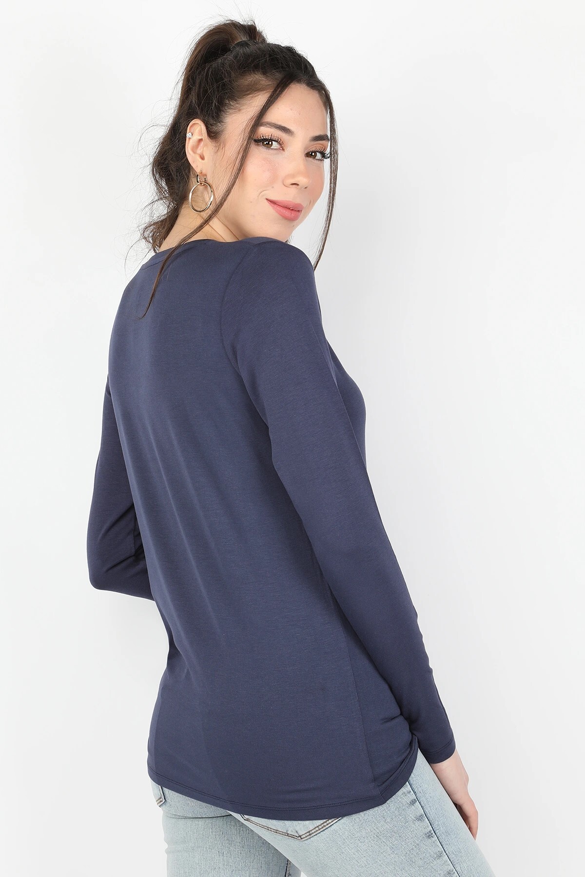 Kadın Viskon Uzun Kollu Tişört Lacivert