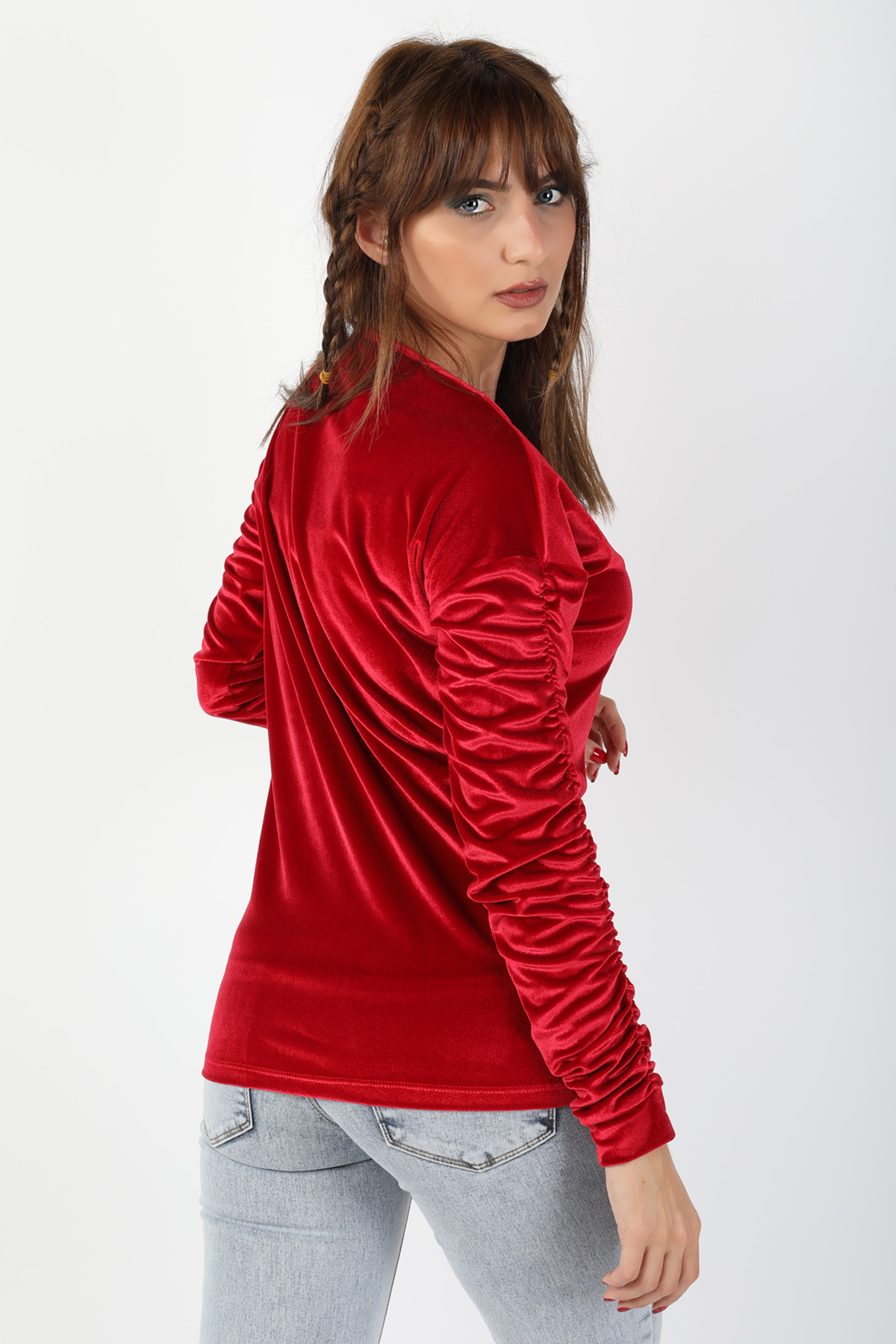 Kol Büzgülü Kadife Bluz Kırmızı